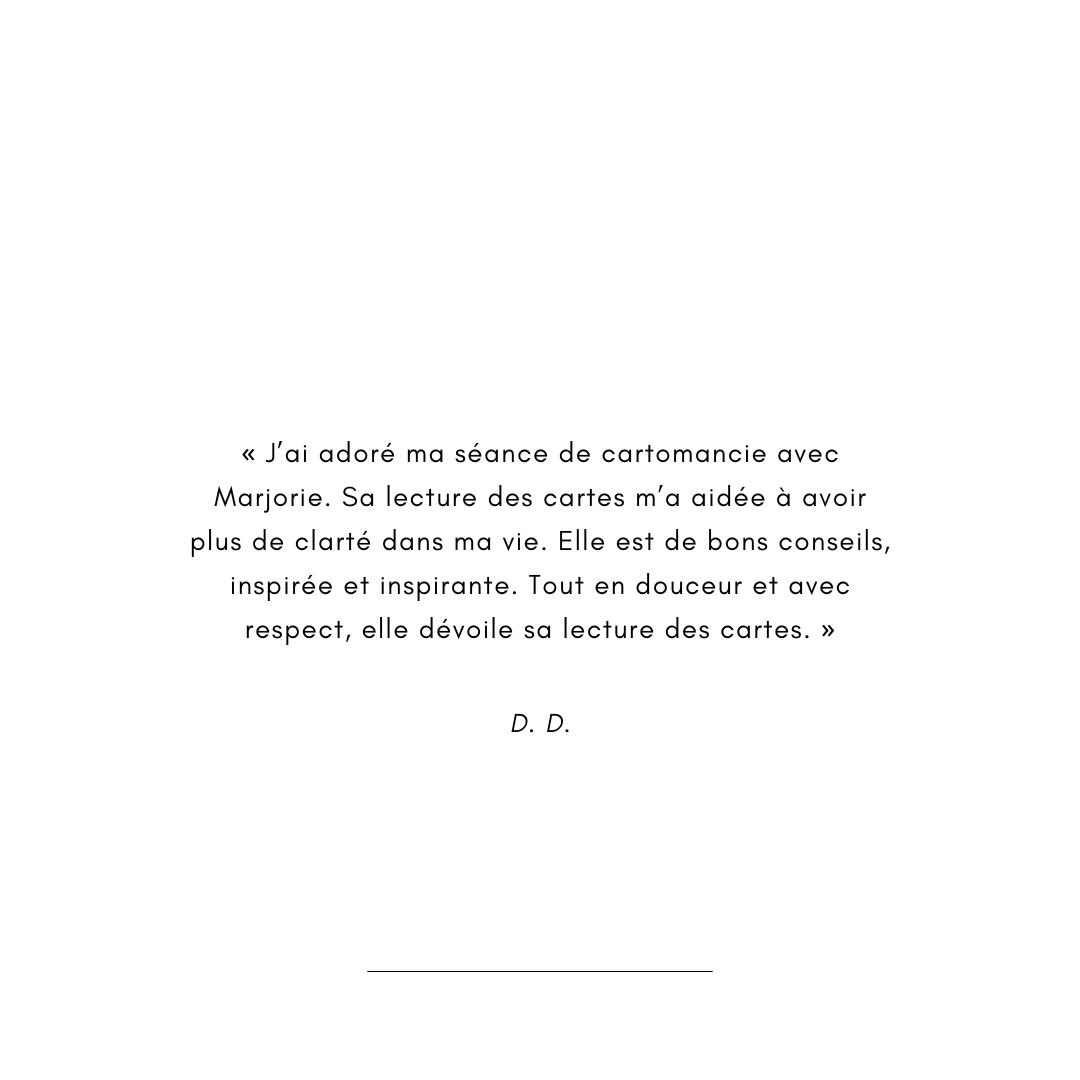Marjorie baigne dans l'ésotérisme depuis l'enfance. Initiée très jeune à la cartomancie ainsi qu’à diverses méthodes divinatoires et expériences mystiques, elle développe intuition et hypersensibilité.