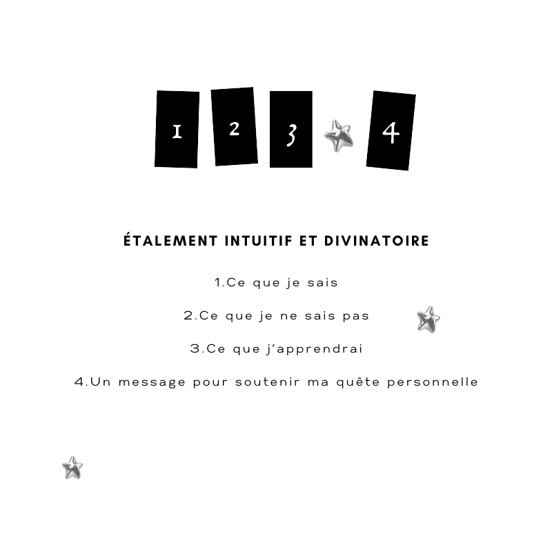 Je me suis inspirée de sa méthode pour créer cet étalement de quatre (4) cartes. Des questions vastes, ouvertes, pour redonner sa place à l’intuition et allouer un moment divinatoire immersif et mystérieux.